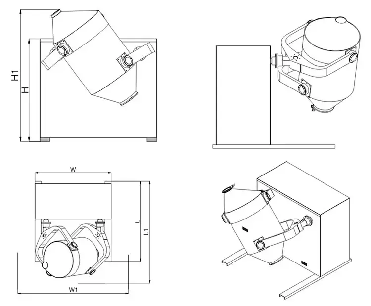该机工作时,混料器具有三维空间运动,在进行自转的同时进行公转,混料器一方面具有强烈的湍动作用,加速了物料的流动和扩散,另一方 面有翻转和平移运动,克服了离心力的影响,使物料不会产生比重偏析和集聚现象,也无死角,保证混合均匀。特点