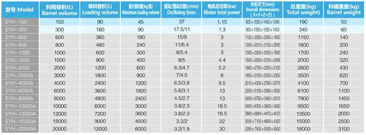 EYH系列二维运动混合机的转筒可同时进行二个运动,一个为转筒的转动,另一个为转筒随摆动架的摆动。被混合物料在转筒内随转筒转动、翻转、混和的同时,又随转筒的摆动而发生左右来回的掺混运动,在这两个运动的共同作用下,物料在短时间内得到充分的混合。EYH二维混科机适合所有粉、粒状物料的混合。外型示意图