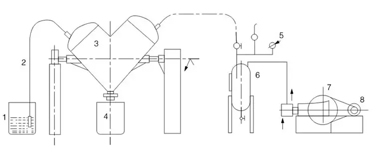 1.物料筒 2.吸料筒 3.混合机 4.出料筒 5.真空表 6.气体净化罐 7.真空泵 8.电动机